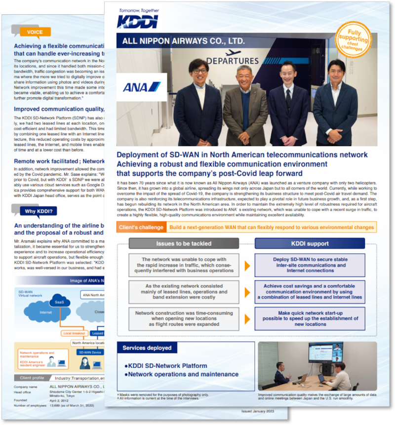 With rapid digitalization, All Nippon Airways (ANA) has undertaken network reform to improve operational efficiency and customer experience. To accommodate the surge in communication volume while maintaining a cost-effective and comfortable communication environment, they implemented the 'KDDI SD-Network Platform.' This initiative enabled the stabilization of inter-site communication and the rapid establishment of networks.