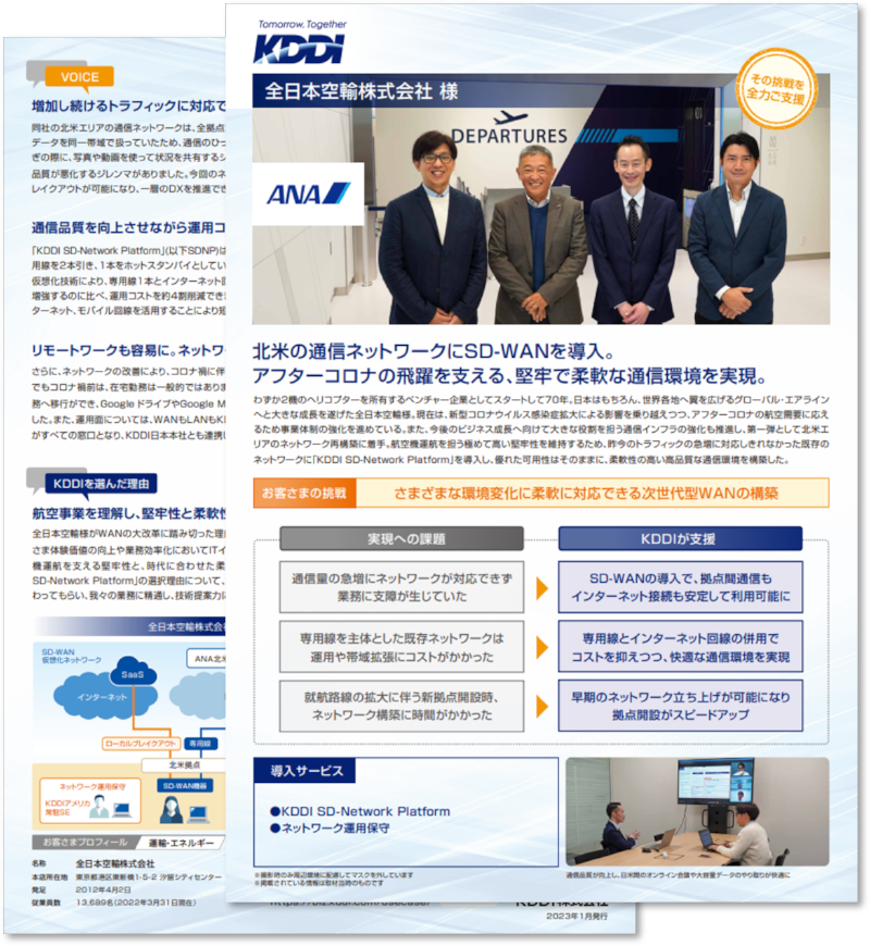 急速なデジタル化が進む中、全日本空輸様は業務効率や顧客体験の向上を目指してネットワーク改革に取り組みました。急増する通信量に対応しつつ、コストを抑えた快適な通信環境を実現するために、「KDDI SD-Network Platform」を導入。この取り組みにより、拠点間通信の安定化と迅速なネットワーク構築が可能となりました。